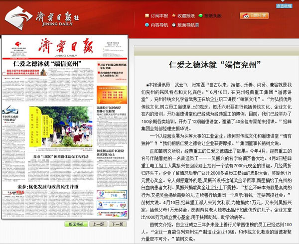 正如苗樹(shù)文所說(shuō),經(jīng)典重工的仁愛(ài)之德結(jié)出了碩果。今年4月,經(jīng)典重工的名號(hào)伴隨著她的一名普通員工———吳振興的名字響徹齊魯大地。4月2日經(jīng)典重工電工組工人吳振興在回家路上拾到一個(gè)裝有7000元現(xiàn)金的錢包,幾經(jīng)周折歸還失主。企業(yè)了解情況后專門召開(kāi)2000多名員工參加的表彰大會(huì),獎(jiǎng)勵(lì)他1萬(wàn)元愛(ài)心獎(jiǎng)金。令人頗感意外的是,吳振興沒(méi)將這筆獎(jiǎng)金帶回家,而是捐給了兗州的白血病患者文利。吳振興捐獻(xiàn)獎(jiǎng)金讓企業(yè)上下震撼。“拾金不昧本身就是高尚的行為,又把獎(jiǎng)金捐給需要的人,連續(xù)善行給集團(tuán)一個(gè)啟示:有錢一定要回報(bào)社會(huì)。”苗樹(shù)文說(shuō)。4月10日,經(jīng)典重工派人來(lái)到文利家,為她捐款1萬(wàn)元,又來(lái)到吳振興家,給他父母1萬(wàn)元獎(jiǎng)金,感謝兩位老人培養(yǎng)出品行如此優(yōu)秀的兒子。企業(yè)又拿出1000萬(wàn)元成立愛(ài)心基金,用于扶困助殘、助學(xué)治病等。
