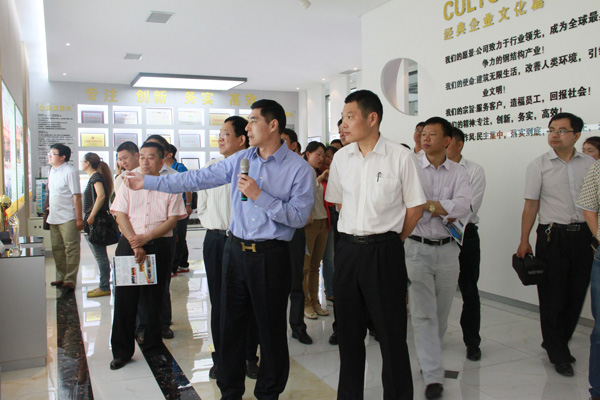 考察團(tuán)一行參觀了經(jīng)典集團(tuán)的文化館、項(xiàng)目中心、綜合辦公室、營(yíng)銷中心和生產(chǎn)車間。苗樹(shù)文董事長(zhǎng)向考察團(tuán)介紹了經(jīng)典集團(tuán)的生產(chǎn)經(jīng)營(yíng)、項(xiàng)目建設(shè)、產(chǎn)學(xué)研合作、技術(shù)創(chuàng)新等情況。隨后,考察團(tuán)一行實(shí)地參觀了經(jīng)典集團(tuán)職工培訓(xùn)室、閱覽室、乒乓球室、臺(tái)球室、愛(ài)心超市和宴會(huì)廳,進(jìn)一步了解了企業(yè)的文化建設(shè)有關(guān)情況。