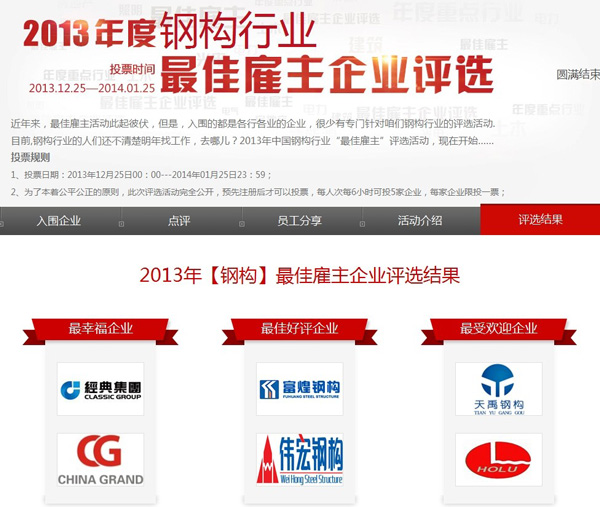 近日,山東經(jīng)典重工集團(tuán)股份有限公司在一覽鋼構(gòu)英才網(wǎng)舉辦的2013年度鋼構(gòu)行業(yè)最佳雇主企業(yè)評(píng)選中榮獲最幸福企業(yè)獎(jiǎng)。