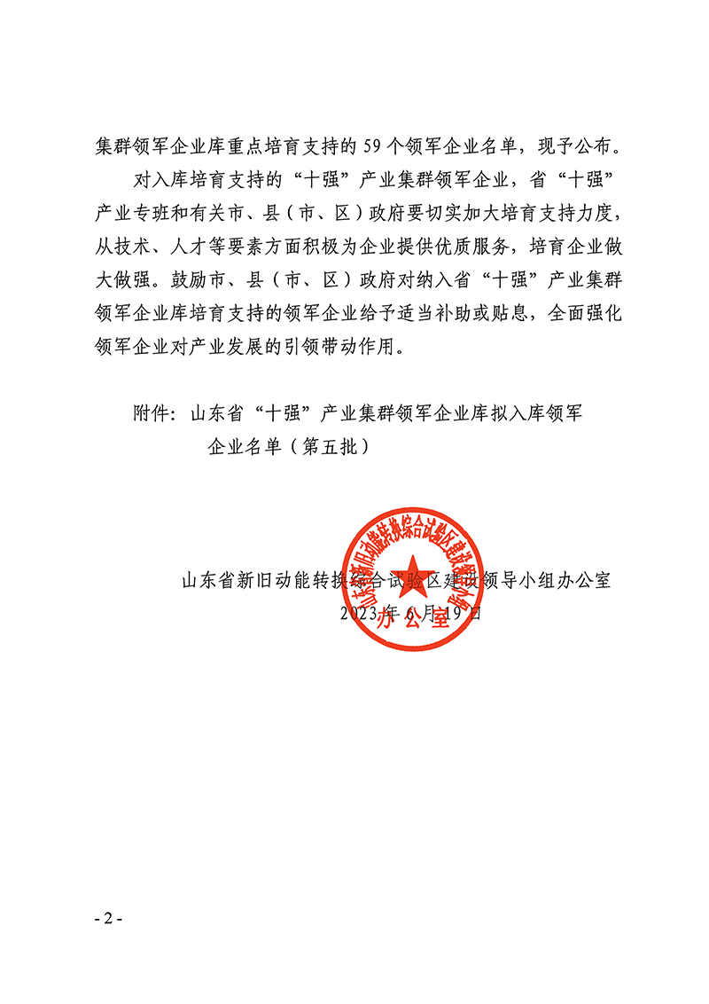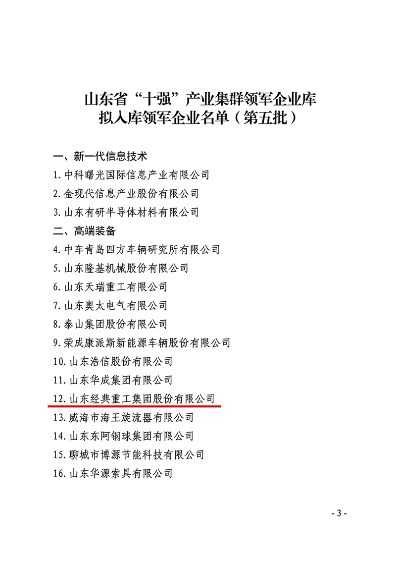 6月19日,山東省新舊動能轉(zhuǎn)換綜合試驗區(qū)建設(shè)領(lǐng)導(dǎo)小組辦公室發(fā)布了《關(guān)于公布山東省“十強”產(chǎn)業(yè)集群領(lǐng)軍企業(yè)名單(第五批)的通知》(魯動能辦【2023】16號),山東經(jīng)典重工集團股份有限公司成功入選山東省“十強“產(chǎn)業(yè)集群領(lǐng)軍企業(yè)名單。
